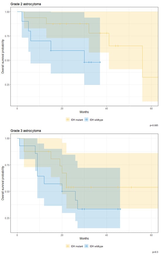 However, when analyzed by grade, IDH mutation does not result in survival differences across astrocytomas of either grade-2 or grade-3 variants (p = 0.085 and 0.300, respectively) (Figure 9).