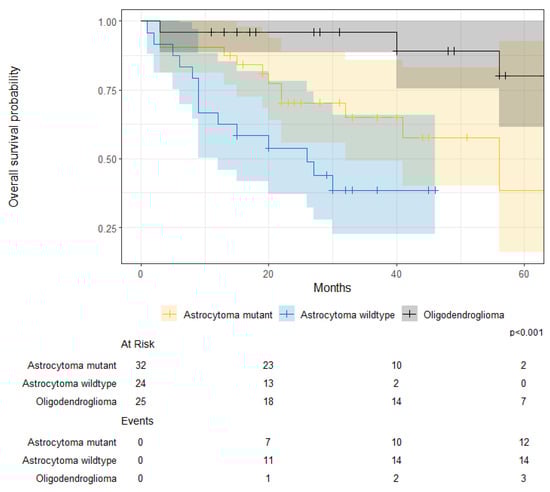 Overall survival probability for patients with astrocytoma mutant, astrocytoma wildtype, and oligodendroglioma between July 2014 and June 2019.