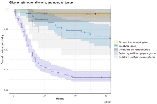 Overall survival probability for patients with gliomas, glioneuronal tumors, and neuronal tumors by subtype at KHCC between July 2003 and June 2019.
