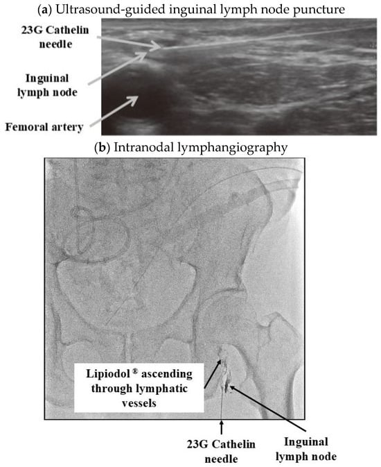 - Sun, X.; Zhou, F.; Bai, X.; Yuan, Q.; Zhang, M.; Ma, L.; Jin, Y. Application of ultrasound-guided intranodal lymphangiography and embolisation in cancer patients with postoperative lymphatic leakage. World J. Surg. Oncol. 2021, 19, 32. [Google Scholar] [CrossRef]