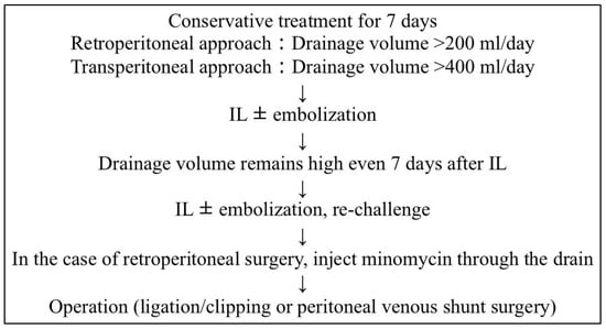 Rose et al. previously conducted a meta-analysis of 146 articles including 523 patients (urological surgery: 213 patients) who developed iatrogenic chylous ascites after retroperitoneal surgery, and reported that 68.5% of patients improved with conservative treatment [6]. The median treatment period for patients who improved with conservative treatment was 11 days (8–16 days), while the median treatment period in patients who required additional treatment due to the inefficacy of conservative treatment (e.g., lymphangiography or surgical treatment) was 22 days (14–42 days), and the median drainage volume was 750 mL/day (600–1140 mL/day). Additionally, lymphangiographic embolization was successful in curing chyle fistulas in 209 (96.7%) of 216 patients who did not improve with conservative treatment. The median time to improvement of chylous ascites after lymphangiography was 6 days (4–8 range). If the drainage volume remains high 7–10 days following lymphangiography, repeat lymphangiography with embolization is appropriate and has been successful in several reports [34,35]. In the meta-analysis of Rose et al., of the seven patients who did not improve with lymphangiography, six patients underwent surgical treatment, and one patient underwent peritoneovenous shunting, ultimately resulting in a cure in all patients. Based on the data obtained, they generated the first evidence-based treatment algorithm for chylorrhea that encompasses various retroperitoneal dissection procedures across several surgical subspecialties. However, in their algorithm, conservative treatment was performed for 21 days, and the drainage volume was set at 750 mL/day as an indicator for changing treatment, resulting in a longer hospitalization period. Therefore, we revised part of the treatment algorithm developed by Rose et al. In order to shorten the treatment period for lymphorrhea and chylorrhea, we decided to evaluate the effectiveness of conservative treatment within 7 days. The amount of drainage fluid used as a cut-off for intervention was changed to 400 mL/day for surgery performed using a transperitoneal approach and 200 mL/day for retroperitoneal surgery. The retroperitoneal approach is often selected for urological surgery. Since there is no absorption of lymphatic fluid from the peritoneum following the retroperitoneal approach, the timing of treatment intervention is set to reduce the amount of drainage compared to the transperitoneal approach. Additionally, adhesive therapy by the injection of minocycline through the drain before surgical treatment has also been described as a treatment option for lymphorrhea and chylorrhea after surgery via the retroperitoneal approach (Figure 3).