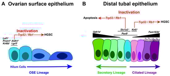 Further studies have identified OSE stem/progenitor cells as the main source of long-term OSE regeneration. Such cells are mainly located in the ovarian hilum region and are characterized by the expression of Aldh1+, Lgr5+, Lef1+, Prom1+, and Krt6b+ [39,40] (Figure 1). Compared to more differentiated OSE cells, stem/progenitor cells are more easily transformed by the inactivation of Trp53 and Rb1 and form HGSC [39,40,41]. These findings support the notion that OSE cells in a stem/progenitor state have a high propensity for malignant transformation, similar to cancer-prone stem cells of the hematopoietic system, intestinal tract, and skin [39,42,43]. Further evaluation of specific differentiation states of human OSE may shed more light on the potential contribution of OSE subpopulations to HGSC formation.