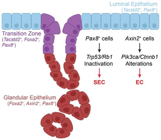 Cell composition of the mouse endometrial epithelium. Putative cancer-prone sites include luminal epithelium (LE; blue, columnar cells), transition zone (purple cells), and glandular epithelium (GE; red, cuboidal cells). The inactivation of Trp53 and Rb1 in Pax8+ cells results in serous endometrial carcinoma (SEC). Pax8 is expressed in both the LE and GE. It plays a critical role in the development of Müllerian duct-derived tissues, such as the uterus and uterine tube. The glandular epithelium contains Axin2+ cells, which are needed for proper glandular development. When an oncogenic form of Pik3ca and overexpression of Ctnnb1 are introduced to these cells, endometrial carcinoma (EC) of an unspecified subtype develops.