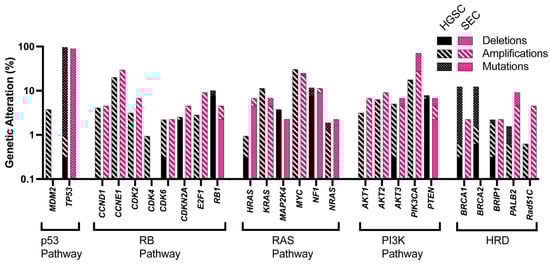 Genomic sequencing of HGSC and SEC tumor samples has been instrumental in identifying genetic drivers of theses cancers [33,68]. Genetic alterations induce transformation and malignant characteristics such as a loss of cell cycle control (RB1 pathways), increased cellular proliferation (RAS and PI3K pathways), and DNA repair deficiencies (HRD pathways).