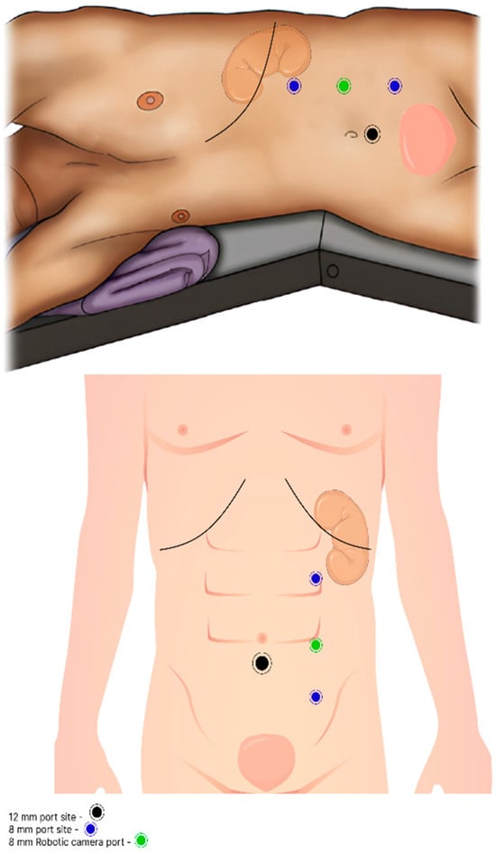 All 15 patients underwent RRNU with BCE by using the Xi da Vinci robotic system. The operator employed a unique intraoperative technique based on single docking for multi-quadrant surgery. After catheter insertion, patients were placed in a modified lateral decubitus position with 30-degree flexion. Trocar placement was planned along the paramedian line, with 8 cm spacing between the trocars. Three 8 mm trocars were used to dock the robotic arms, and a robotic camera was inserted through the middle port. An additional 12 mm trocar was placed in the abdominal midline, inferior to the umbilicus, and 5 cm from both the camera and the third arm trocars, forming a triangular configuration (Figure 1). The camera was initially directed toward the renal area for targeting, enabling optimal robotic arm positioning and rotation for the nephrectomy portion of the procedure.