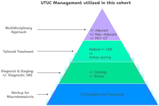 Management of upper tract urothelial carcinoma (UTUC) utilized in our cohort. CT-U—computed tomography urography; LND—lymph node dissection; PET-CT—positron emission tomography–computed tomography.
