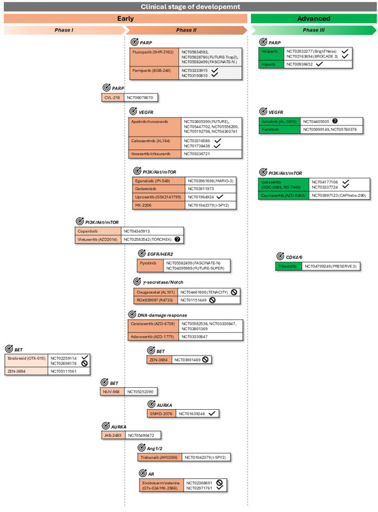 Three PARP inhibitors are listed: fluzoparib and pamiparib [8] together with CVL-218. Then, there are another three VEGFR inhibitors [8,26]: apatinib (or rivoceranib), which specifically binds VEGFR2; cabozantinib, which targets VEGFR2 as well as several other kinases; and ibcasertib (or chiauranib), which targets VEFGR, PDGFR, and other kinases.