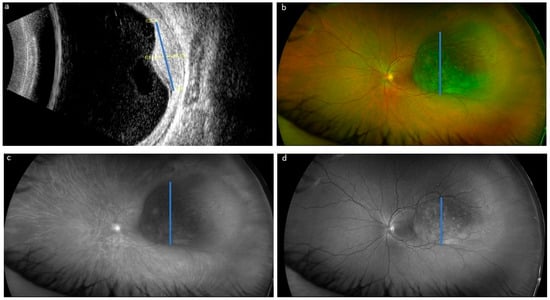 Several new imaging techniques have emerged in recent years, many of which have proven useful to better characterize these lesions and complement ultrasonography. For instance, MRI is becoming more popular and may give a more accurate volume calculation, but it is expensive and less immediate since it is not available in our daily ophthalmology practice [10,11,12,13]. With regards to ophthalmologic complementary testing, optic coherence tomography (OCT) and wide-field fundus imaging have an important role in our everyday practice [14,15,16]. The advent of noncontact ultrawide-field imaging systems has enabled the capture of the posterior pole and peripheral retina up to 200° in a single image. One example of this new technology is Optos® (Optos, Marlborough, MA, USA), an ultrawide-field (UWF) scanning laser ophthalmoscope (SLO) that uses two laser wavelengths (red and green) to generate three different types of images: green laser view (green channel) images for the retina and its vasculature, red laser view (red channel) images for the choroid, and images with a combination of the two to digitally generate a pseudocolor realistic fundus image.