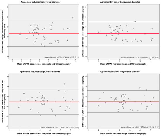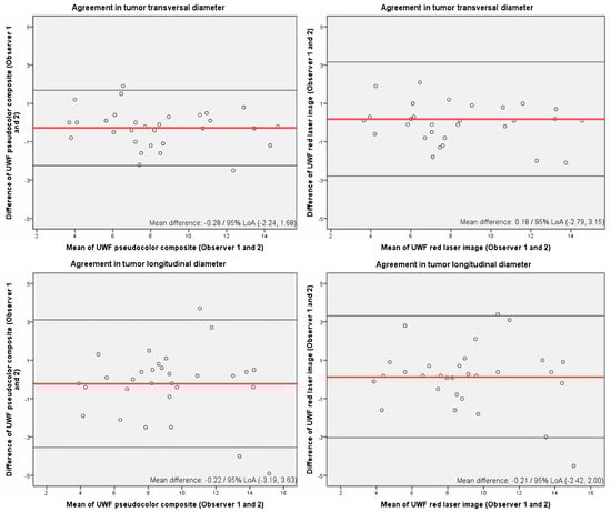 Firstly, interobserver agreement in UWF imaging was assessed. Table 2 shows the mean lesion sizes obtained by each observer and paired t-test results. Paired t-tests revealed that measurements from the pseudocolor and red channel images for both diameters were not statistically different when measured by the two observers (p > 0.05). However, for the green channel images, both observers stated that in 20 cases, the tumor could not be measured and, when it was possible, the values were statistically different (p < 0.05). For this reason, green channel images were not compared further. Figure 2 shows Bland–Altman plots for interobserver agreement in pseudocolor and red channel UWF imaging. The mean difference was around zero (between −0.28 and −0.13) in all cases, and 95% of the measurements fell within the limits of agreement except for the longitudinal pseudocolor images, where 6.7% of the points of the longitudinal basal diameter measurements were located outside the 95% limits of agreement.