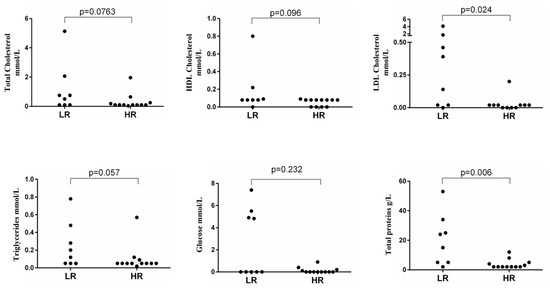 Cystic fluid biochemical parameters in high- and low-risk IPMN patients. p < 0.05 was considered significant. LR, low-risk; HR, high-risk.
