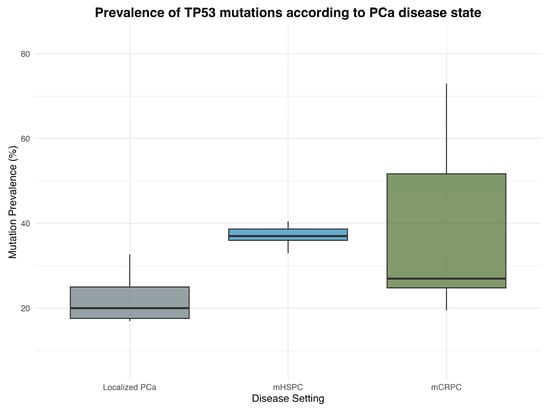 Prevalence of TP53 mutations in localized PCa, mHSPC, and mCRPC according to cited published data [,,,,,,,,,,,,].
