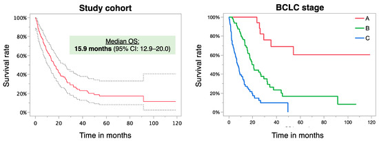The median survival time of the study cohort was 15.9 months (95% CI: 12.9–20) with 6-month, 1-year, 2-year, and 3-year survival rates of 75.3%, 55.8%, 29.2%, and 13.0%, respectively. The median OS times according to BCLC stage A/B/C were as follows: median not reached, 19.3 (95% CI: 15.3–27), and 7.2 (95% CI: 4.5–9.0) months, respectively (p = 0.001) (Figure 1). The median OS times stratified for the Child–Pugh class A/B/C were 23.5 (95% CI: 17.1–32.1), 10.4 (95% CI: 6.5–15.5), and 5.2 (1.4–.) months, respectively (p < 0.0001). In UVA, several pretreatment factors were found to be significantly associated with OS (Table 2).