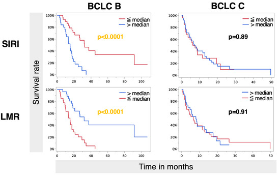 In the MVA group, several factors remained independent predictive factors for OS, with BCLC remaining the strongest factor (p = 0.0001). Furthermore, the ALBI grade, tumor burden, and size of the largest liver lesion remained significant. Regarding inflammatory markers, only LMR and SIRI remained significant. Further subanalysis revealed that a survival benefit for both higher LMR and lower SIRI was seen in BCLC B patients with a longer median OS of 32.0 months (95% CI: 18.7–.) vs. 15.3 (95% CI: 9.7–19.3) for higher LMR and a prolonged median OS of 32.4 months (95% CI: 20.9–91.5) vs. 15.3 (95% CI: 10.3–27.0) for lower SIRI (p < 0.0001). No significant difference was observed in BCLC stage C (Figure 2).