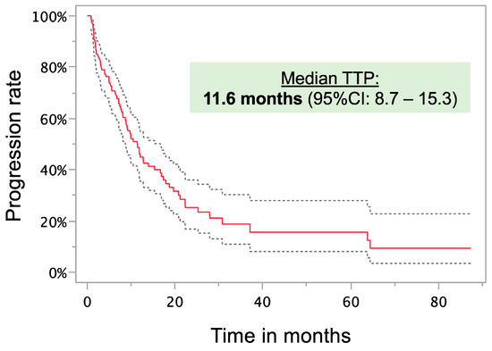 The median TTP was 11.6 months (95% CI: 8.7–15.3) (Figure 3). The results from the best response according to mRECIST with median survival and TTP for each group are shown in Table 3. It should be noted that imaging was not routinely performed after each imaging, which may have biased the analysis. Regarding best achieved response and inflammation, the rate of patients with SIRI > median was the highest for PD (progressive disease, 79.0%), followed by PR (partial response, 51.4%), SD (stable disease, 43.8%), and CR (complete response, 26.7%) (p = 0.015). Statistical significance was also seen for LMR > median (CR: 73.3%; PR: 45.7%; SD: 58.3%; PD: 21.1%; p = 0.011), dNLR > median (CR: 26.7%; PR: 42.3%; SD: 55.3%; PD: 73.7%; p = 0.033), and non-elevated CRP (CR: 58.8%; PR: 42.9%; SD: 26.4%; PD: 17.4%; p = 0.016). All significant factors in the MVA of OS were included in the TTP UVA. Only BCLC stage, hepatic tumor burden, size of the largest lesion, and SIRI were significant factors in the univariate analysis. In the MVA group, only BCLC stage and hepatic tumor burden remained independently significant.
