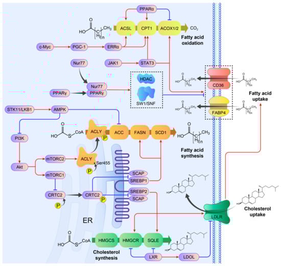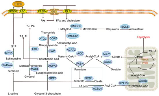 The metabolism of cholesterol comprises two principal processes: the synthesis of cholesterol and its uptake and secretion. The mevalonate pathway is the process of cholesterol synthesis. In total, three molecules of acetyl-CoA are thiolized, then combine to form hydroxymethylglutaryl-CoA (HMG-CoA) under the catalysis of HMG-CoA synthase (HMGCS). Next, HMG-CoA is reduced to form mevalonate by HMG-CoA reductase (HMGCR) [26]. Mevalonate is activated by ATP and then condensed to form squalene. Lanosterol is produced by epoxidation of squalene, which is catalyzed by squalene cyclooxygenase (SQLE). Lanosterol is finally converted to cholesterol in the presence of oxygen and NADPH [10]. As with the uptake of fatty acids, cholesterol uptake can be accomplished through the function of LDLR. Cholesterol levels are also influenced by cholesterol secretion through the export of lipoproteins.