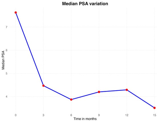 Median PSA level at 0, 3, 6, 9, 12, and 15 months.