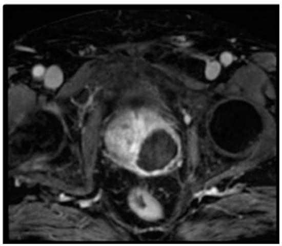 In all patients, mpMRI performed 6 and 12 months after the procedure showed coagulative necrosis of the treated area. Only two patients underwent a prostate biopsy after one year, both due to a positive mpMRI. In one patient, the target region was PIRADS 4 in the non-treated lobe and, in the other subject (Figure 4), a PIRADS 3 area was adjacent to the treated zone. In the first patient, we performed a target biopsy in the ipsilateral and contralateral lobes. Two out of eight cores were positive in the treated lobe with Gleason score 6 (3 + 3) adenocarcinoma of the prostate. In this case, radical treatment and active surveillance were discussed, and the patient decided on a conservative option. In the second patient, we performed the fusion biopsy in the target zone and contralateral lobe, and the result was negative for cancer. The other patients did not undergo mpMRI due to the absence of clinical relapse suspicion. Prostate biopsy was not proposed at one year, by default, following the EMA/AIFA guidelines.