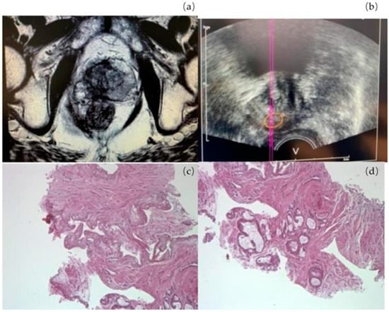 T2-weighted axial MRI images (PIRADS 4) (a); fusion biopsy (b); tumor area GS 6 (c); area of necrosis (d). The line and circle represent a machine function during biopsy.