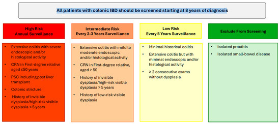 High-risk patients, including those with a family history of CRC (aged ≤ 50 years), colonic strictures, prior dysplasia, PSC, or extensive colitis with significant inflammation, should continue to undergo annual colonoscopy. Intermediate-risk patients should undergo screening every 2–3 years, while patients without high- or intermediate-risk factors can be screened every 5 years (Figure 1). Following a negative screening colonoscopy, the interval for subsequent surveillance should be tailored based on individual risk factors, including the extent of colonic inflammation, family history of CRC, presence of PSC, history of dysplasia, and the frequency and quality of prior examinations. Surveillance is most effective when the disease is in clinical and endoscopic remission, as this minimizes the likelihood of inflammation-related complications and allows for clearer detection of dysplastic changes [5]. Disease staging biopsies, obtained from multiple colonic segments, should be utilized to assess histologic disease activity and extent, which can guide future surveillance intervals [5,47].