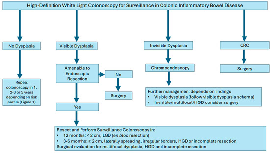 Management strategies typically depend on the focality of the dysplasia (unifocal vs multifocal), endoscopic resection ability, and histopathology (LGD vs. HGD). For example, unifocal visible dysplastic lesions may be treated with endoscopic resection techniques such as endoscopic mucosal resection (EMR) or endoscopic submucosal dissection (ESD) followed by frequent colonoscopies to monitor for changes. Colectomy for example, may be considered for patients with multifocal dysplasia, lesion not amenable for full endoscopic resection or additional risk factors (PSC with dysplasia or CRC). Furthermore, if invisible dysplasia is detected on non-targeted biopsies and subsequently confirmed by an expert pathologist, it is imperative to conduct a repeat colonoscopy with chromoendoscopy. This procedure should include both targeted and non-targeted biopsies performed by an expert IBD endoscopist to ensure accurate assessment and management (Figure 2) [64,73].