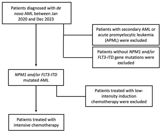 Individual patient data were collected from the Greek AML registry. Patients, aged > 18 years old, with de novo AML, carrying the mutation(s) NPM1 and/or FLT3-ITD, who were treated with intensive chemotherapy between January 2020 and December 2023, were included in the study (Figure 1). The intensive chemotherapy regimen included cytarabine/idarubicin-based induction, followed by consolidation with high- or intermediate-dose chemotherapy. Patients with FLT3-ITD mutated AML also received midostaurin as an FLT3 inhibitor. A pre-defined data set was collected, including the following: age at diagnosis, sex, NPM1/FLT3-ITD mutational status, karyotype, other mutational gene analysis (myelodysplasia gene mutations and KRAS/NRAS), type and response to induction chemotherapy, events (treatment failure, relapse, death) and date of last contact. Patients with acute promyelocytic leukemia and secondary AML were excluded from the study.