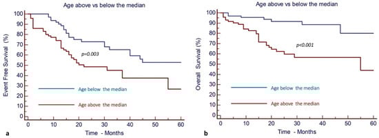 Patient ages above the median were statistically associated with significantly worse EFS and OS as compared to ages below the median.