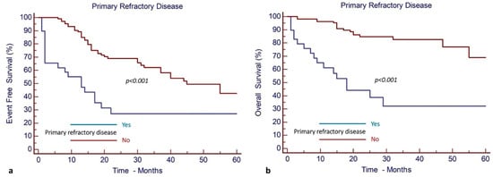 Primary refractory disease was reported to have a significantly negative impact on EFS and OS. More specifically, patients without primary refractory disease exhibited an EFS and OS of 69% (95% CI, 49–82%) and 93% (95% CI, 75–98%), respectively, whereas patients with primary refractory disease had an EFS and OS of 28% (95% CI, 4–61%) and 29% (95% CI, 5–62%), respectively (Figure 5).