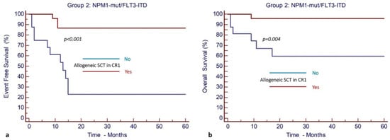 Allogeneic stem cell transplantation in CR1 results in improved outcomes in patients with NPM1mut and FLT3-ITDmut AML (Group 2). (a) EFS and (b) OS.