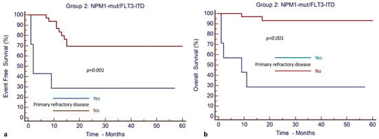 Primary refractory disease has a negative impact on outcomes of patients with NPM1mut and FLT3-ITDmut AML (Group 2). (a) EFS and (b) OS.