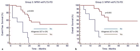 Allogeneic stem cell transplantation in CR1 confers improved outcomes in patients with isolated FLT3-ITD gene mutation (Group 3). (a) EFS and (b) OS.