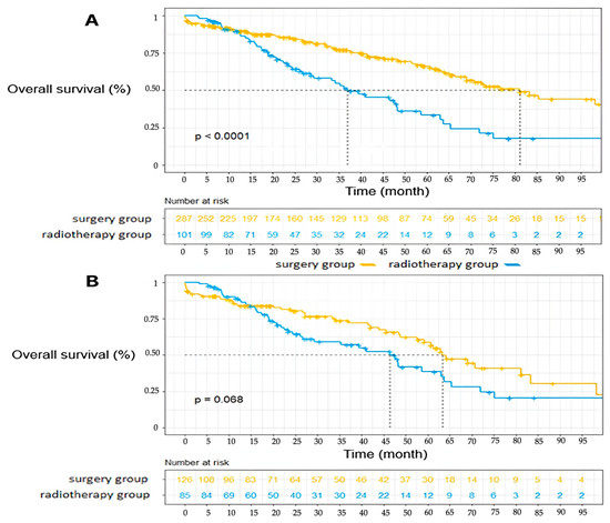 | Surgery Group (n = 127) | Radiotherapy Group (n = 85) | p Value | |