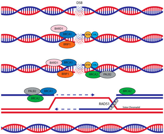 Schematic diagram for DNA double-strand break (DSB) repair by homologous recombination: BRCA1, DNA-repair-associated gene; BRCA2, DNA-repair-associated gene; BRIP1, BRCA-interacting DNA helicase 1; BARD1, BRCA1-associated RING domain 1; PALB2, partner and localizer of BRCA2; ATM, serine/threonine kinase; CHEK2, checkpoint kinase 2; RAD51, RAD51 recombinase.