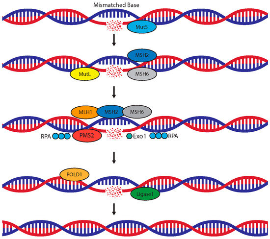 DNA mismatch repair is an important mechanism to eliminate base mismatches and deletions/insertions that could appear during DNA replication and maintain genomic stability. Impairments in the process within microsatellite regions will lead to microsatellite instability and mutations. MSH2, mutS homolog 2, and MSH6, mutS homolog 6, are tumor suppressors, working in DNA mismatch repair. The encoded protein of MLH1, mutL homolog 1, heterodimerizes with mismatch repair endonuclease PMS2 to form MutL. Other proteins involved in MMR are replication protein A, Exonuclease 1, DNA polymerase delta, and DNA ligase 1. The presumed schematic diagram for MMR is presented in Figure 3.