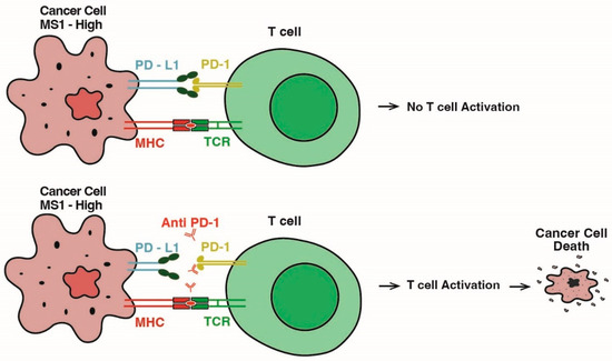 Several types of cancer immunotherapy have become valuable tools in the management of specific tumors. Among them, the inhibition of immune checkpoint blockade through programmed cell death 1 (PD-1) and its ligand (PD-L1) is considered to be a common approach for cancer therapy [24]. The binding of the inhibitory PD-1 receptor on T-cells to its ligand, PD-L1, on the surfaces of cancer cells leads to T-cell inactivity and immunosuppression. Multiple cancers can upregulate PD-L1 expression, thus escaping host immune defense mechanisms. PD-L1 expression is positively correlated with a deficiency in DNA MMR genes and microsatellite instability in cancer cells and is implicated in metastatic CRPC [25,26], making it possible to use PD-1/PD-L1 inhibitors in order to expose tumor cells to host immune attack.
