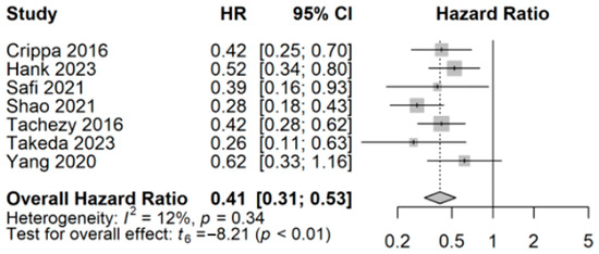 Seven studies reported univariate hazard ratios (HRs) that were pooled for meta-analysis [25,26,29,30,31,32,33]. All included studies reported an HR comparing the OS of synchronous resection and synchronous metastatic patients with a control cohort, which did not undergo resection of the primary or metastatic cancer. Meta-analysis estimated a pooled HR for OS to be 0.41 with a 95% confidence interval of 0.31 to 0.53 (Figure 2). This combined analysis indicates a statistically improved survival (p < 0.01) for patients who received synchronous resection compared to palliation. Heterogeneity was relatively low, as measured by I2 = 12%. Due to the differences in study design, inclusion criteria differed across studies included in the meta-analysis. Four studies [29,31,32,33] reported HRs of overall survival for strictly patients who underwent synchronous resection versus non-resection patients. Two studies reported a split cohort, in which either primary chemotherapy resulted in complete regression of hepatic metastasis (Crippa et al., n = 3/11) in a subset of patients or hepatic lesions were unable to be detected with ultrasound intra-operatively and were subsequently not resected (Takeda et al., n = 5/10). Hank et al. reported an HR that contained patients who had resection of peritoneal or lymph node metastasis (n = 26/93) in addition to synchronous hepatic resection patients (n = 67/93). The majority of the combined resection cohort consisted of patients undergoing synchronous resection of the primary PDAC and hepatic metastases (n = 269/308, 87%).