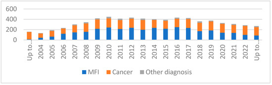 Regarding the temporal trend in semen cryopreservation, the number of cryopreservation procedures performed has changed significantly over the years. In particular, between 2004 and 2010, the number of cryopreservation procedures gradually increased, remaining essentially stable between 2012 and 2019 and then recording a progressive decline from 2020 to today. The highest number of cryopreservation procedures occurred in 2012, in which 442 new patients were recorded. The number of new cryopreservation procedures in patients with cancer remained essentially stable over the years; on the contrary, there was a decrease in cryopreservation procedures in patients with MFI (in particular, from 2020 up to November 2023) (