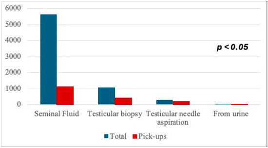 Table 1), we found that infertile patients who cryopreserved via testicular biopsy picked up in 38.1% of cases, from seminal fluid in 39.9% of cases, by testicular needle aspiration in 70.5% of cases and from urine in 80.0% of cases, with the highest rate of pick-up in patients undergoing testicular aspiration and collection from urine.
