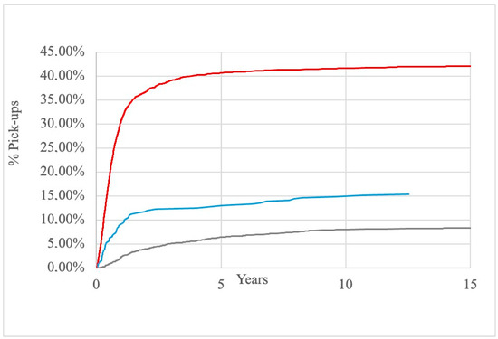 Regarding the association between age and pick-ups, by dividing the population into different age subgroups, it was observed that patients belonging to younger age groups at the time of cryopreservation had a lower pick-up rate (and therefore a lower use) of cryopreserved semen compared to intermediate-age patients and older patients, with a significant difference (