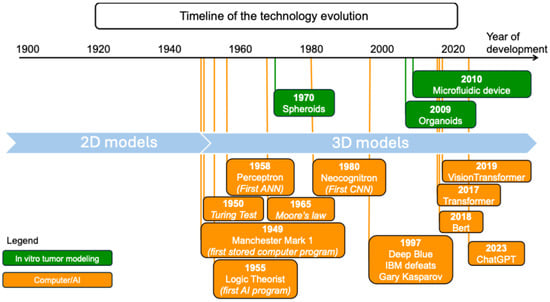 The timeline of the technology evolution for representative techniques used in the context of in vitro tumor modeling and AI. Adapted with permission of [].