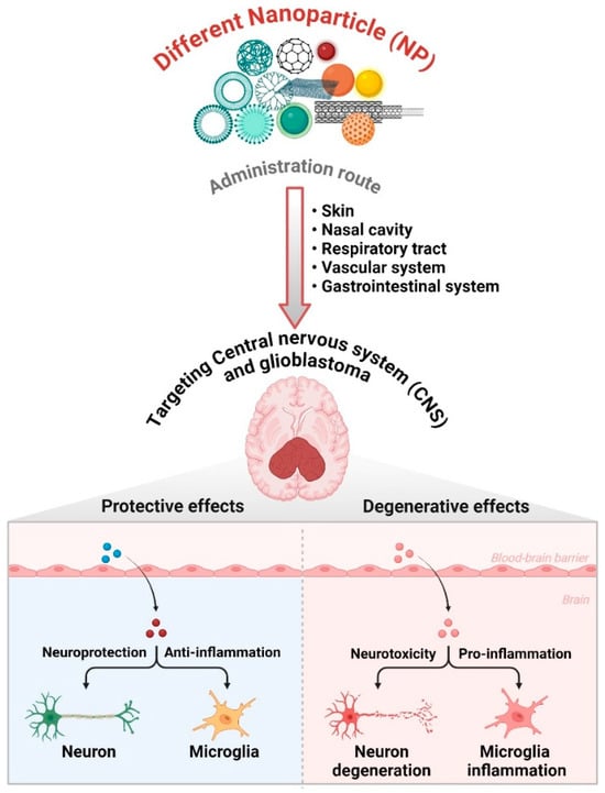 Effects of different nanoparticles on the central nervous system and glioblastoma. Nanoparticles (NPs) are administered into the central nervous system (CNS), including the gastrointestinal tract, respiratory system, nasal cavity, and skin. NPs cross the BBB to specifically target various brain cells such as neurons, microglia, and astrocytes. The impact of these nanoparticles can be either protective or degenerative, depending upon their characteristics and interactions within the central nervous system. The function of NPs in therapeutic approaches, especially in the treatment of glioblastoma, is in their ability to regulate the advancement of the disease and the reactions of cells in the CNS environment. The figure was created and modified using the BioRender.com online commercial platform.