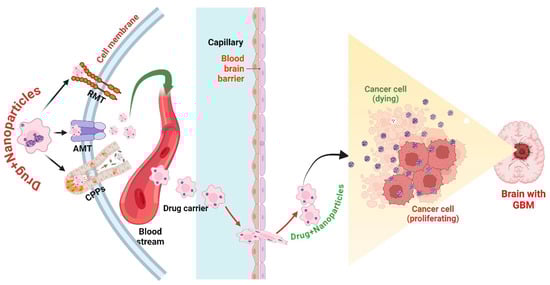 Nanoparticles have become a potent instrument in cancer treatment, providing distinctive characteristics that render them well-suited for drug delivery systems []. Nanoparticles are often described as particles with sizes ranging from 1 to 100 nanometers [] and which possess the capacity to transport and administer therapeutic substances directly to cancer cells []. Nanoparticles possess advantageous characteristics such as their diminutive size, significant surface area-to-volume ratio, and adjustable surface qualities []. These attributes enable accurate drug targeting and regulated drug release, rendering them an appealing choice for the treatment of malignancies such as GBM []. The presence of the BBB poses a major obstacle in the treatment of brain malignancies, such as GBM []. The BBB consists of closely interconnected endothelial cells that form the lining of the brain’s blood arteries []. Its main function is to restrict the passage of most medicines and therapeutic agents into the brain []. Nanoparticles have demonstrated the capacity to traverse the BBB by different routes, including receptor-mediated transcytosis, adsorption-mediated transcytosis, and passive diffusion []. Through the utilization of these routes, nanoparticles could efficiently transport medications directly to the location of the brain tumor []. This has the potential to enhance the amount of the therapeutic substance at the tumor site while reducing the overall toxicity to the body [].