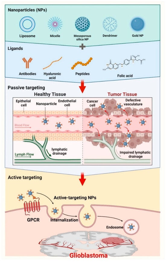 Precise localization of the tumor site is essential for optimizing the efficacy of medication delivery systems utilizing nanoparticles. Tumor targeting can be accomplished by passive and active targeting techniques, each providing unique benefits in improving medication delivery to GBM cells (Figure 4).