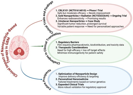 Clinical impact of nanoparticle-based therapy in GBM. The clinical impact of nanoparticle-based therapies in glioblastoma (GBM) treatment through three key sections. (1) Current clinical trials and findings: Summarizes trials such as those involving CRLX101 (NCT01614010), gold nanoparticles with radiation (NCT02022644), and irinotecan nanoparticles, highlighting their efficacy and challenges. (2) Challenges in clinical translation: Addresses regulatory hurdles, pharmacokinetics, toxicity, and immunogenicity concerns. (3) Future prospects: Emphasizes the optimization of nanoparticle design, personalized medicine, and expanded clinical trials. The figure was modified using the BioRender.com online commercial platform.