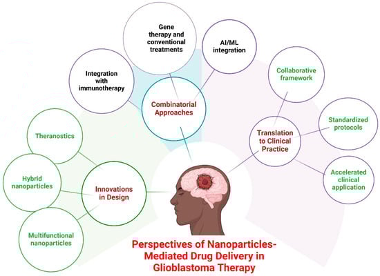 Future research and technology improvements are anticipated to overcome current limitations and improve the clinical usefulness of these novel drug delivery methods. As research advances, multidisciplinary collaborations across nanotechnology, oncology, and computational science will be essential for enhancing nanoparticle-mediated drug delivery for more effective and practical GBM treatments. A summary of future perspectives of nanoparticle-mediated drug delivery in glioblastoma therapy is presented in Figure 6.