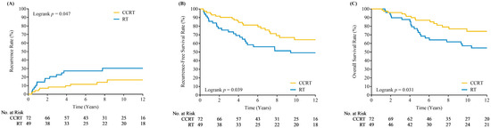 Kaplan–Meier plots of loco-regional recurrences (A), recurrence free survivals (B) and overall survivals (C) for patients who underwent concurrent chemoradiotherapy (CCRT) versus radiotherapy alone (RT).