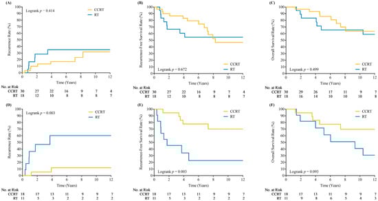 Kaplan–Meier plots of loco-regional recurrences, recurrence free survivals and overall survivals for patients with subglottic extension (A–C) and impaired cord mobility (D–F) who underwent concurrent chemoradiotherapy (CCRT) versus radiotherapy alone (RT).