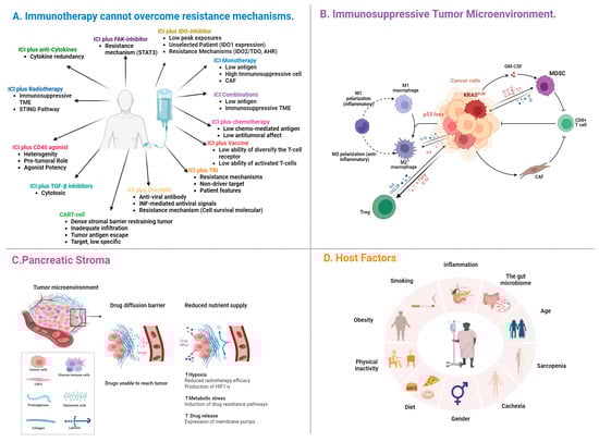 Reasons for the failure of immunotherapies in PDAC. (A) Reasons related to immunotherapeutic agents. (B) Reasons related to the tumor microenvironment. (C) Reasons related to pancreatic stroma. (D) Reasons related to host factors. Created in BioRender. Demir, T. (2025) https://BioRender.com/m54a934 (accessed on 7 February 2025).