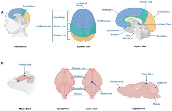 Distinct locations of the pineal gland in the human (A) and mouse (B) brains.
