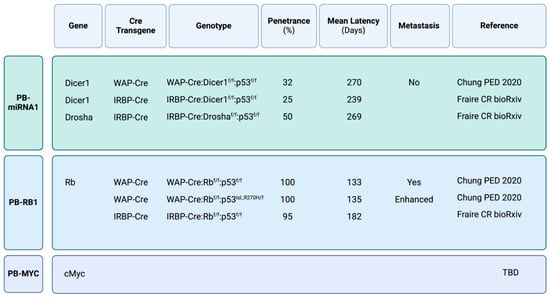 An unpublished work submitted to bioRxiv describes the generation of IRBP-Cre:Rbflox/flox:p53flox/flox, IRBP-Cre:p53flox/flox:Dicer1flox/flox and IRBP-Cre:p53flox/flox:Droshaflox/flox mice [95]. Latency and penetrance was similar to those observed in WAP-Cre:Rbflox/flox:p53flox/flox and WAP-Cre:Dicer1flox/flox:p53flox/flox mice [94] (Figure 2). Thus, deletion of Rb and Dicer1 via two different promoter (WAP-Cre and IRBP-Cre) induces PB with similar histology and penetrance that mimic the human disease.