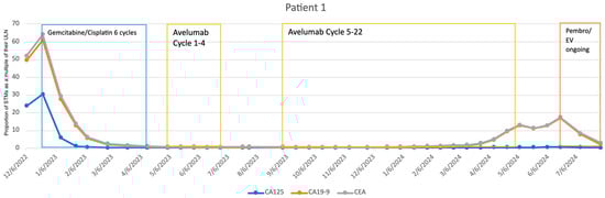 Patient 1’s treatment course with Serum Tumor Markers. Note: STM values have been adjusted to fit within a graphical space. STM values were adjusted by dividing by their values by their respective upper limit of normal (CA 19-9: 37 U/mL; CA-125: 35 U/mL; CEA: 3 U/mL). As a result, any value greater than 1 is representative of an abnormal lab finding.